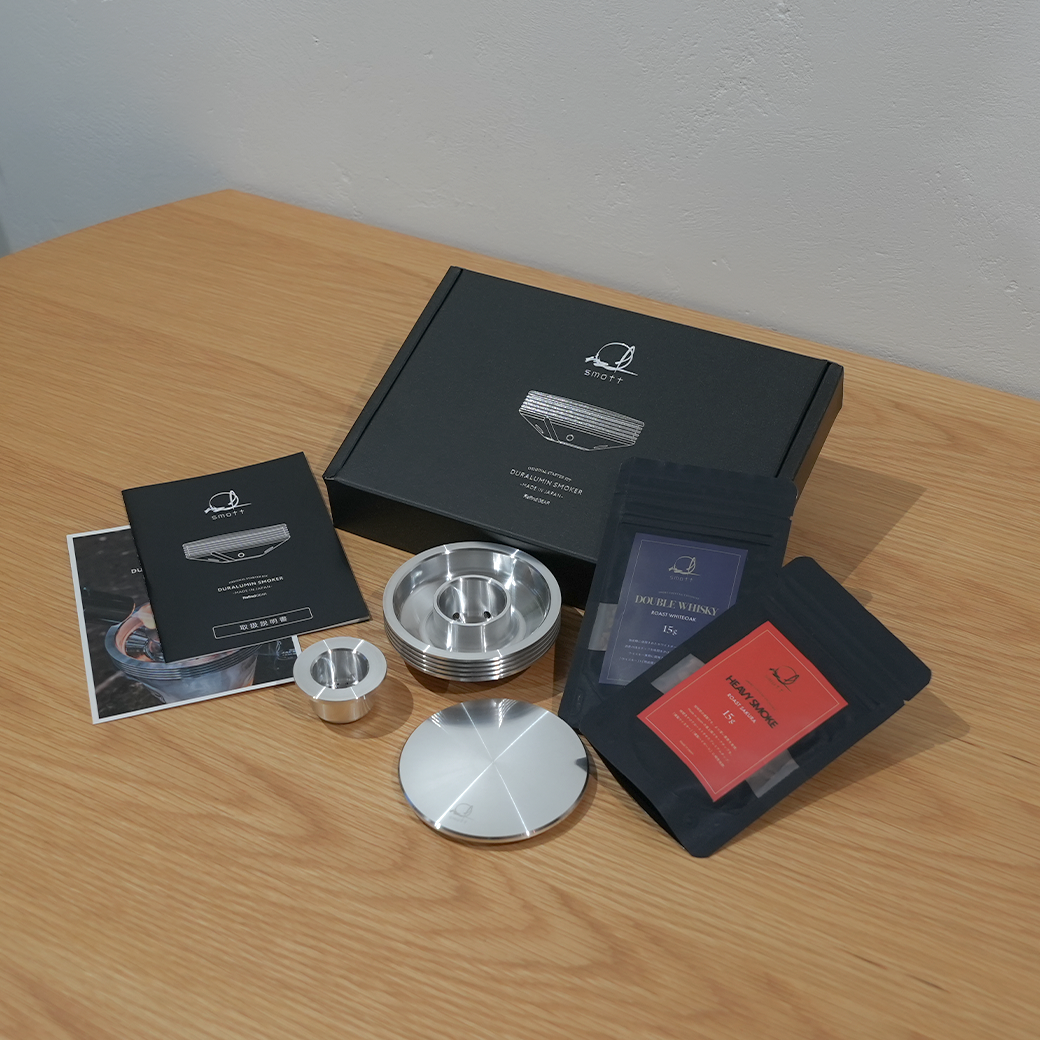 smott(スモット)は、燻煙をウイスキーにダイレクトに落とし込み、自宅やキャンプでも手軽に燻製ウイスキーを楽しむことができる、ジュラルミン削り出しのグラストップスモーカーです。誰でも手軽に1分でウイスキーを本格燻製。お酒に限らず、おつまみの燻製にもご使用いただけます。